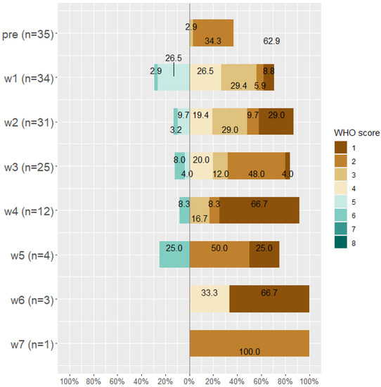 WHO score for improved patients (n = 35) before taking Tocilizumab and at weeks 1, 2, 3, 4, 5, 6, and 7 after Tocilizumab administration.