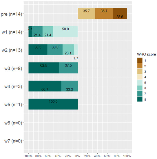 WHO score for worsened patients (n = 14) before taking Tocilizumab and at weeks 1, 2, 3, 4, 5, 6, and 7 after Tocilizumab administration.