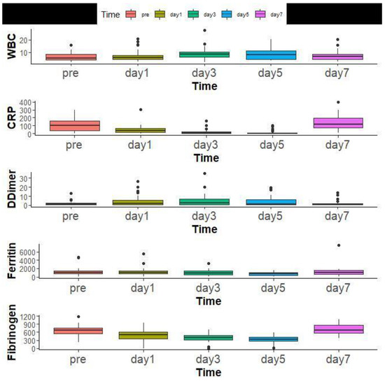 The median WBCs Count before TCZ administration was 6.79 (IQR 2.40–20.3) and significantly increased over time. The inflammatory markers, including CRP, D-Dimer, Ferritin, and Fibrinogen, also significantly improved over time (Figure 6).