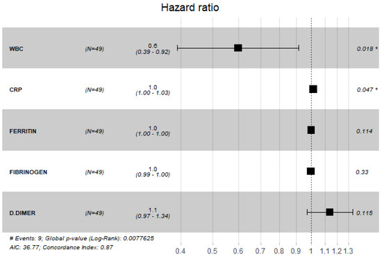 The findings of COX proportional hazard regression model revealed a significant increase in the odds of mortality with elevated WBC count and CRP ((RR = 0.60, 95% CI: (0.39, 0.92), p = 0.018), (RR = 1.00, 95% CI: (1.00, 1.03), p = 0.047), respectively) (Figure 7).