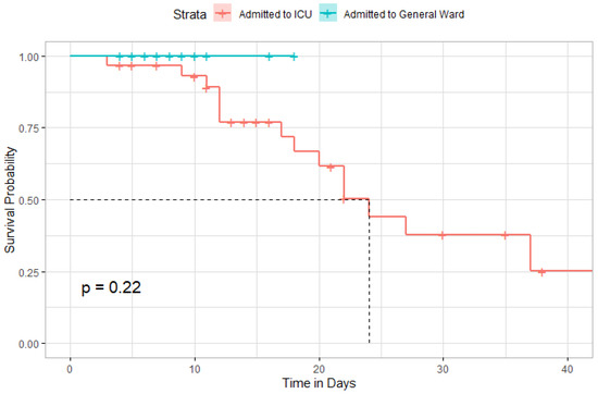 Kaplan–Meier curve comparing the survival distribution between admitted patients to ICU or general ward.