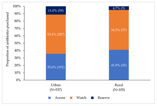 Of the 642 courses of antibiotics purchased, 234 (36.4%), 344 (53.6%), and 64 (10.0%) were from the Access, Watch, and Reserve groups, respectively. Seven antibiotics accounted for 80.1% of total dispensing. These included three antibiotics from the Access group (metronidazole [14.1%], flucloxacillin [7.2%], and amoxicillin [5.5%]) and four from the watch group (cefixime [18.8%], azithromycin [16.7%], ciprofloxacin [9.5%], and cefuroxime [8.3%]) (Table 3). Dispensing of non-prescribed antibiotics was higher in the Access group (139/234, 59.4%), followed by that in the Watch (160/344, 46.5%) and Reserve (28/64, 43.8%) groups (Table 3). Dispensing of antibiotics from the Access, Watch, and Reserve groups accounted for 191 (35.6%), 287 (53.4%), and 59 (11.0%), respectively, in urban pharmacies and for 43 (41.0%), 57 (54.3%), and 5 (4.7%), respectively, in rural pharmacies (Figure 1).