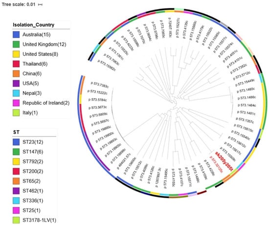 Maximum likelihood phylogenetic tree including the sk205y205t K. pneumoniae isolate (in red and bold type) and background strains retrieved from the PATRIC database. The geographic origin of all the strains is reported on the first level colored ring. The sequence type of the strains is indicated on the second colored ring.