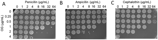 Synergistic bactericidal activity of octyl gallate (OG) in combination with β-lactams, including (A) penicillin, (B) ampicillin, and (C) cephalothin.