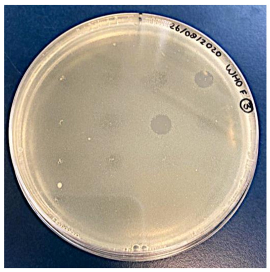 Attempts were made to optimize the propagation methods by (i) prolonging the incubation time of the cut-out lysis zones, (ii) enriching the cut-out lysis zones with the appropriate indicator strain, and (iii) adding chloroform to assist the bacterial lysis process after incubation of the cut-out lysis zones. None of these attempts resulted in the replication of lysis zones. Enriched samples from the pool of ESwabs™ that showed clear zones were spotted on five other bacterial species (Pseudomonas aeruginosa, Staphylococcus aureus, Escherichia coli, Acinetobacter baumannii, and Enterococcus faecalis) but did not show any lytic activity.
