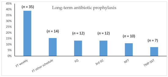 Long-term prophylactic antibiotic prescriptions, FT: Fosfomycin trometamol; FQ: fluoroquinolones; 3rd GC: 3rd generation cephalosporins; NFT: nitrofurantoine; TMP-SXT: trimethoprim-sulfamethoxazole.