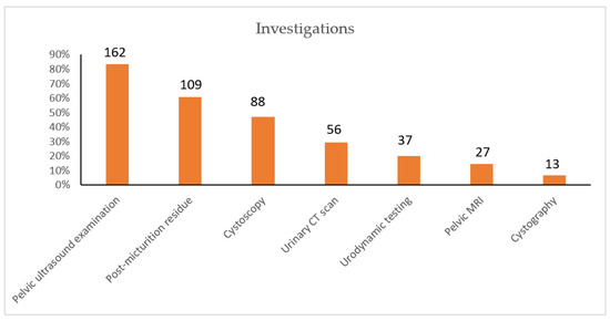 Prior to seeking infectious diseases specialist advice, 79% of women had consulted a urologist and 74% a gynaecologist. Examination of the perineum was not systematic; patients were not always informed of the conclusion. Investigations undergone by patients are shown in Figure 3.