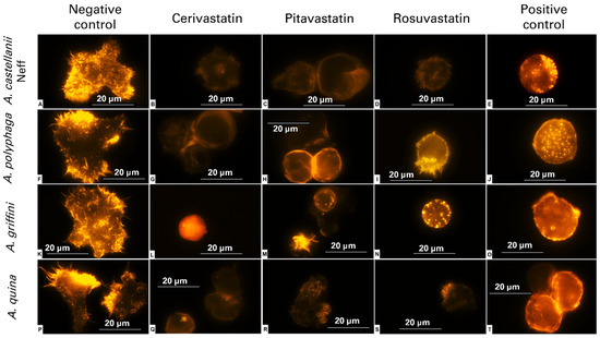Actin networks and the organization of cytoskeletal structures are indispensable elements of the cellular morphology, adhesion, motility and pathogenicity of adherent cells, namely, Acanthamoeba [10]. Thus, we inspected the eventual effect of statins on the cytoskeleton and the actin’s network, using specific actin staining. After 24 h of incubation with the statins at IC90, (Table 2) the rounded cells emitted less intense fluorescence than the negative control (Figure 1A,F,K,P), reflecting complete disorganization of the actin fibers and total loss of the cytoskeletal structure (Figure 1).