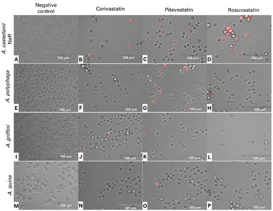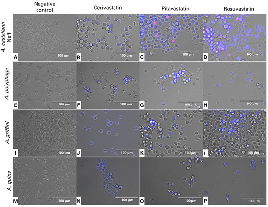 Images of Acanthamoeba castellanii Neff (A–D), A. polyphaga (E–H), A. griffini (I–L) and A. quina (M–P) showing the effect of IC90 of cerivastatin (B,F,J,N), pitavastatin (C,G,K,O) and rosuvastatin (D,H,L,P), relative to the negative control (non-treated amoebae) (A,E,I,M), after 24 h of incubation in vitro. Hoechst stains treated trophozoites nuclei in bright blue, showing chromatin condensation, while red fluorescence corresponds to the propidium iodide dye, which stains the DNA of dead cells. All images were captured using an EVOS FL Cell Imaging System EVOS™ M5000 (40× magnification). Images shown are representative of the cell populations observed in each experimental condition.