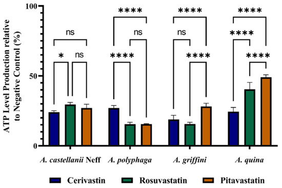 Effect of IC90 of statins on the ATP production of Acanthamoeba castellanii Neff, A. polyphaga, A. griffini and A. quina trophozoites, using CellTiter-Glo® luminescent cell viability assay. Results are represented as percentages relative to the negative control. Differences between the values were assessed using one-way analysis of variance (ANOVA). Data are presented as means ± SD (N = 3); ns, non-significant. * p < 0.05 and **** p < 0.0001 are significance differences when comparing the different mean values.