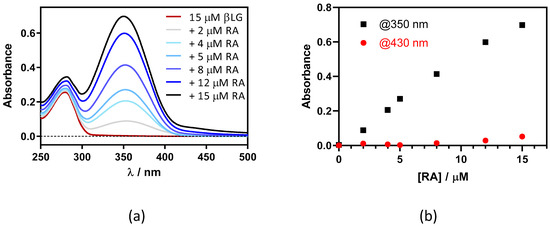This was confirmed by adding RA to a fixed concentration of βLG (15 μM) in PBS (Figure 3). Two maxima can be observed in the absorption spectrum, one at 280 nm and the other at ~350 nm, which are assigned to βLG and RA, respectively (Figure 3a). At RA concentrations higher than 5 μM, a new band at 430 nm appears due to the formation of RA aggregates in solution. As can be observed in Figure 3b, the band at 350 nm linearly increases upon addition of the RA, while the band at 430 nm only begins to increase above 5 μM of RA. This indicates that RA only starts to aggregate when the protein is saturated by RA.