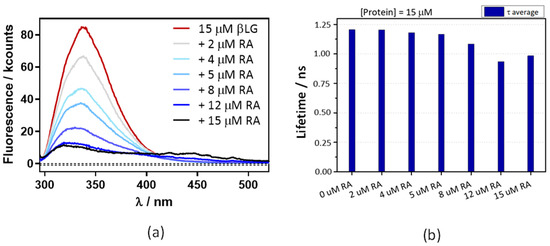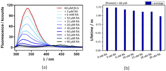 A decrease in βLG fluorescence lifetime (a) and intensity (b) with increasing concentrations of RA. βLG concentration was fixed at 15 μM, excitation at 280 nm, and detection at 340 nm. The fluorescence showed multiexponential decay, thus the amplitude-averaged decay lifetime is plotted.