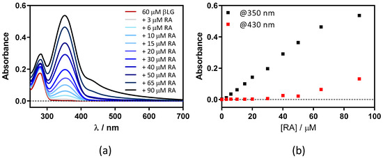 (a) Absorption spectra of retinoic acid (RA)–β-lactoglobulin (βLG) mixtures at increasing RA concentrations (between 0 and 90 μM). βLG concentration was fixed at 60 μM. (b) The evolution of the absorbance at 350 nm and 430 nm upon titration.