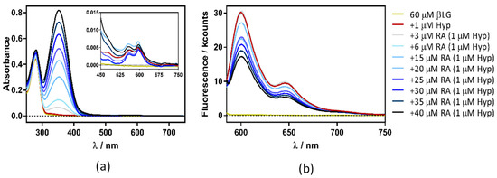 Figure 7 shows the absorption and fluorescence plots resulting from titrating the βLG–Hyp complex with RA. The experiment yielded similar results irrespective of Hyp concentration (1, 4, or 8 µM).