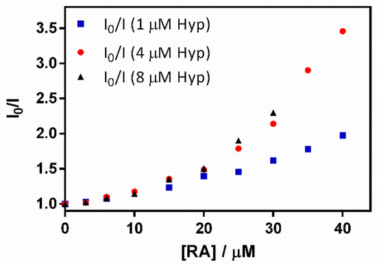 The plots presented an initial linear trend until about 20 μM of RA, after which an upward curvature begins to take place, which is much more evident for 4 and 8 μM than for the lower Hyp concentration. This non-linear relationship suggests a concentration-dependent competition between dynamic and static quenching [24].