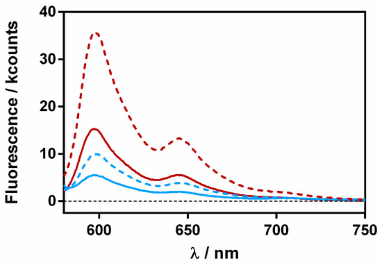 Fluorescence emission spectra of βLG-Hyp complex (60 μM and 8 μM, respectively) in the presence of 20 (red) and 40 (blue) μM RA. The solid lines represent the complex in solution and the dashed ones after a 30-min incubation with S. aureus.