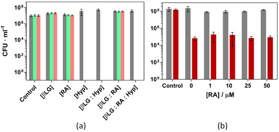 Photoinactivation of S. aureus ATCC 29213 under green light (521 ± 19 nm) and (a): Combinations of βLG, RA and Hyp (40, 10 and 4 μM, respectively) exposed to 18 (green) and 37 (pink) J·cm−2 of light fluence. (b): Combinations of βLG (40 μM), Hyp (1 μM), and increasing concentrations of RA, exposed to 5 J·cm−2 of light fluence (red bars). Grey bars are the dark controls in both panels.