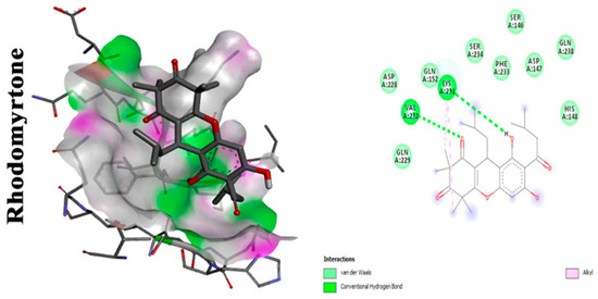 Molecular docking analysis showing (two-dimensional) 2D and (three-dimensional) 3D representation of interaction patterns of rhodomyrtone with CrtM receptor [25].