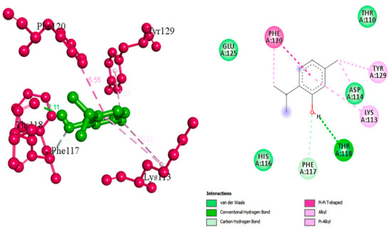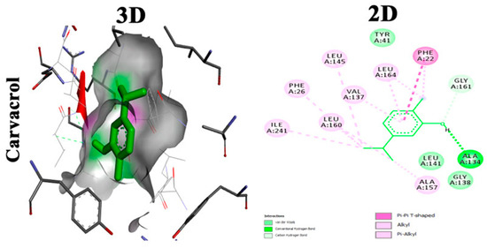 Carvacrol is a phyto-deravative essential oil well known for its aromatic properties that contribute to its wide use as a spice. It has a wide range of biological activities such as anti-inflammatory, analgesic, antipyretic and antimicrobial activities [46]. Moreover, it was found to be clinically safe and tolerable when given to healthy individuals [47]. Selvaraj et al. studied the anti-virulence capabilities of carvacrol against MRSA. Sub-inhibitory concentrations of carvacrol (25, 50, and 75 μg/mL) have been tested against numerous MRSA isolates to detect antibiofilm activity. Carvacrol inhibited the production of STX that rendered MRSA isolates susceptible to reactive oxygen species and whole blood killing. Transcriptomic analysis using (qPCR) revealed the downregulation of sarA gene alongside the downregulation of CrtM gene in the treated isolates. Computational molecular docking unveiled a high affinity of carvacrol towards CrtM gene and SarA regulator in S. aureus. In vivo studies hypothesized the capability of carvacrol to mitigate the propagation of MRSA infection in the model as well as maintain a nontoxic effect on the cells of G. mellonella larvae [25]. Molecular docking analysis showing two-dimensional (2D) and three-dimensional (3D) representation of interaction patterns of carvacrol with CrtM receptor is displayed in Figure 3.