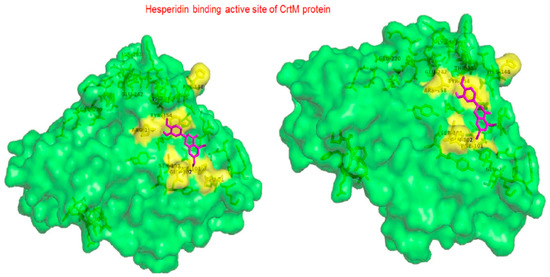 Hesperidin is well known in the treatment of type II diabetes and cardiovascular disorders, and has potent anti-inflammatory and antioxidant properties. It is generally safe with no adverse effects when tested on humans and animal models [50]. A recent study held by Vijayakumar et al. evaluated the potential anti-infective effect of hesperidin, a flavanone glycoside of plant origin, against MRSA clinical isolates. Hesperidin drastically reduced the production of the carotenoid pigment of MRSA isolates which in turn compromised the survival of MRSA under oxidative stress imposed by H2O2. Staphyloxanthin inhibition is believed to be due to the downregulation of crtM gene in MRSA cells. Computational analysis using molecular docking confirmed the capability of hesperidin binding to CrtM proteins involved in STX production (Figure 5). Moreover, hesperidin was proved to have other anti-virulence activities against clinical isolates of S. aureus, such as the significant inhibition of hemolysin, autolysin, and lipase, as well as its antibiofilm potential [51].