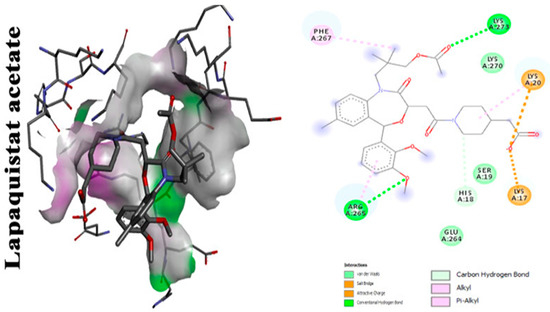 Molecular docking analysis showing 2D (on the right panel) and 3D (on the left panel) representation of interaction patterns of lapaquistat acetate with dehydrosqualene synthase receptor [25].