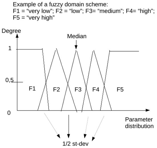Data extracted were analyzed using ad hoc Python scripts (Python 3,6 for Linux). Standard statistical and scientific libraries were used for analysis and graphics (Scipy, Statistics, Sklearn, Numpy, Pandas, Mathplotlib) [,]. Fuzzy domains were calculated for all non-null values, assuming data distribution in three overlapping triangular regions and two rectangular trapezoids at the extremities (with the triangular part overlapping the adjacent triangular region). Dimensions of each region and overlapping were automatically calculated for each parameter (starting from basic statistical analysis of the sample), assuming that the limits of the whole domain could describe 95% of population observations. A specific fuzzy domain was produced for every parameter.
