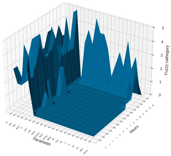 Charts for fuzzy representation of parameters and for clustering were produced, as well as charts for each patient ICU stay (excerpts of 14 h of ICU stay of two random patients are presented in Figures 2 and 3).