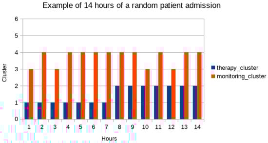 Changes in antimicrobial therapy clusters in a random patient in the population. Respective monitoring clusters in the same hour are charted. In the sample of 14 h here proposed the patient is in therapy cluster 1 (blue bars) for 7 h and starting at hour 8 is in cluster 2. Next to blue bars are red bars for monitoring clusters in the same hours.