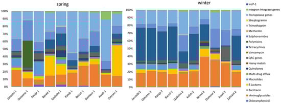 Proportional abundances of targeted genes grouped into gene families according to their function per river in spring and in winter in 10 estuarine Lebanese rivers samples. qac genes: genes conferring resistance to quaternary ammonium compounds.