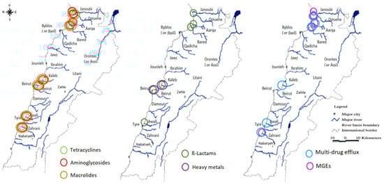Here, we confirmed the estuaries of Lebanon as putative host-spots for the dissemination of ARGs and resistant bacteria into the Mediterranean Sea. Recreational waters such as rivers and beaches have gained increased attention as having a central role in the persistence, dissemination, and emergence of antibiotic resistance [54]. Specific surveillance systems should be put in place that trace urban movements, contact with recreational waters, pollution levels, and WW treatment levels and management to trace the actual dissemination of antimicrobial resistance through recreational waters [55].