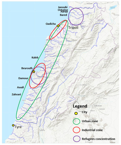 High anthropogenic impact locations. A map from “Rivers, Lebanon, 2012. https://maps.princeton.edu/catalog/stanford-wn533df2039” (accessed on 10 December 2021) representing the Lebanese rivers, modified to show locations on the Lebanese cost of the largest industrial zones (Beirut and Tripoli), the highest urbanized area, and the location of refugees, according to the UNHCR, UN-habitat 2014, and the UNRWA 2021 organizations.