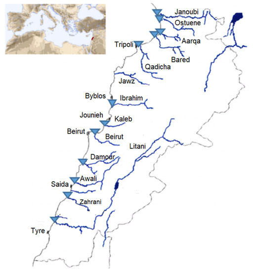 Sampling sites are represented as blue triangles on the map of the Lebanese rivers. Figure adapted from Houri and El Jeblawi (2007).
