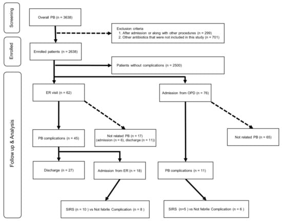 To analyze the incidence of complications according to the type of antibiotic prescribed, patients who experienced procedure-related complications within 2 weeks of the PB and were treated in the ER or an outpatient setting were categorized as Cx1. Patients who required inpatient treatment for procedure-related complications within 2 weeks of PB were categorized as Cx2. Patients who required inpatient treatment due to SIRS within 2 weeks of PB were categorized as Cx3. Patients were diagnosed with SIRS when they met two or more of the following criteria: fever > 38.0 °C or hypothermia < 36.0 °C, tachycardia > 90 beats/min, tachypnea > 20 breaths/minute, and leukocytosis > 12 × 109/L or leukocytopenia < 4 × 109/L. Patients with a history of ER visits were categorized as Cx4, and those with a history of hospitalization were categorized as Cx5.