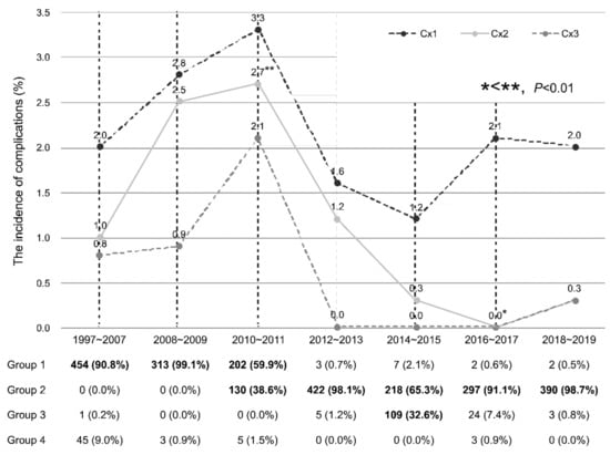 Figure 3 shows the incidence of complications and regimen of prophylactic antibiotics after PB in the clinical cohort according to the year. Most patients were prescribed the prophylactic antibiotic of Group 1 in 1997–2007, 2008–2009, and Group 2 in 2012–2013, 2016–2017, and 2018–2019. Group 1 and Group 2 regimens were used in 59.9% of patients in 2010–2011 and 65.3% in 2014–2015, respectively. Additionally, the majority of the remaining patients were prescribed Group 2 antibiotics in 2010–2011 and Group 3 regimens in 2014–2015. There was no recent increase in complications of Cx1, Cx2 and Cx3 in each period. Cx2 occurred more frequently in 2010–2011 than in 2016–2017 (p < 0.01)