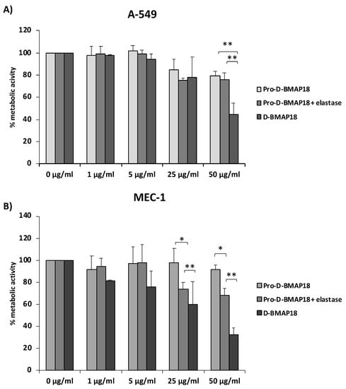 Cell viability assay in the presence of NE-activated Pro-D-BMAP18. An MTT assay was performed using (A) adenocarcinomic human alveolar basal epithelial cells A-549 and (B) B-chronic lymphocytic leukaemia cells MEC-1. The percentages shown are of metabolically active cells compared with untreated controls after 24 h incubation with different concentrations of Pro-D-BMAP18 with or without NE and D-BMAP18. Results of three different experiments in internal triplicate (n = 9). * = p < 0.05; ** = p < 0.01. A Student’s n = of the treatments vs. the untreated control is reported.
