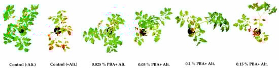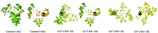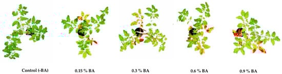 The range of BA and PBA concentrations, described in 4.1., was applied in the experiment. To test the antifungal effect, preventive application of PBA was carried out 2 days prior to inoculation by foliar spraying of plants with a hand sprayer. For comparison, different concentrations of BA or distilled water were applied on plants 2 days prior to their inoculation. A separate control group contained plants that were treated with analogous concentrations of PBA or BA, without inoculation with the pathogen. For inoculation purposes, tomato plants were wounded using carborundum powder in suspension with A. alternata according to Fallik et al. [63], which were applied by a hand sprayer. After inoculation, the tomato plants were covered with plastic foil for 48 h to achieve high humidity, after which the plants were kept in optimal greenhouse conditions (25 ± 2 °C) until the first symptoms appeared.