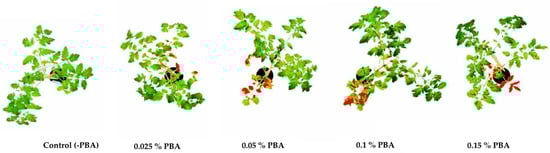 The results of the PBA application on tomato plants, compared to the untreated control, after 14 days are shown in Table 3 and Figure 2. The physiological lesion area was recorded on plant leaves onto which the PBA was applied. Test plants treated with PBA in concentrations 0.025% and 0.05%, showed 7% and 25% of the lesion area, respectively, while those treated with 0.1% and 0.15% PBA developed 31% and 29% of lesion area, respectively. The mean measured physiological lesion areas were significantly higher (Tukey test, p < 0.05) than those on the control plants with no PBA applied (Table 3).