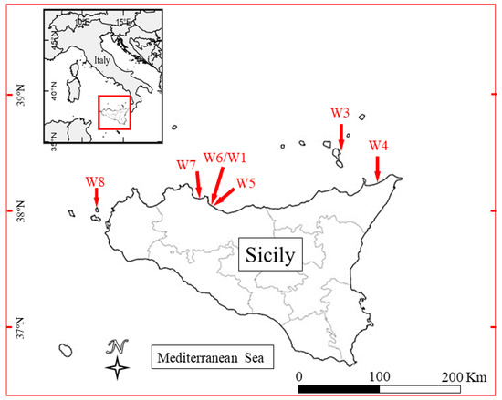 Map of the sampling site: Santa Flavia (W1/W6); Lipari (W3); Rometta (W4); Casteldaccia (W5); Acqua dei corsairi (W7); and Levanzo (W8).