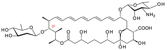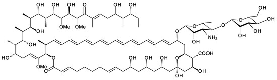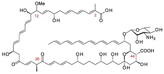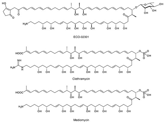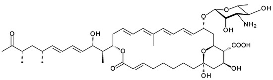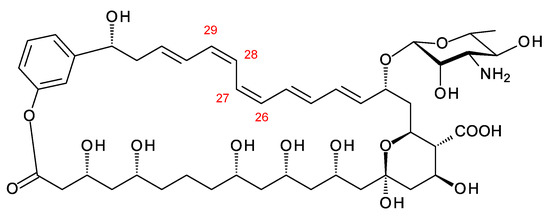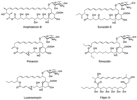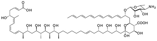 Polyene macrolides are antifungal agents that are synthesized by actinomycetes and other bacteria [1]. These compounds consist of macrolactone rings containing between three and eight conjugated double bonds (Figure 1). Most are glycosylated with a single aminodeoxysugar and specifically bind ergosterol in fungal cell membranes. Some non-glycosylated pentaenes, such as filipin, interact with cholesterol, are less selective, and disrupt eukaryotic membranes in general. Hundreds of glycosylated polyene macrolides (GPMs) have been identified and chemically characterized, at least partially [2]. A few are used as antifungal antibiotics. One of these, amphotericin B, is the gold standard for treatment of systemic mycoses [3]. It is also used to treat diseases caused by Leishmania parasites, which have ergosterol and closely related sterols in their membranes [4].