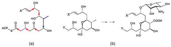 Conserved hemiketal structure that forms in polyene macrolides. (a) A hexamodular polyketide synthase protein synthesizes this region of the polyketide chain from malonyl-derived acetate (red arrows) and methylmalonyl-derived propionate (blue arrow) building blocks. (b) Exocyclic carboxyl group formation and glycosylation with mycosamine occur in this region. X represents the primer end of the polyketide chain, and Y represents the carboxy-terminal end.