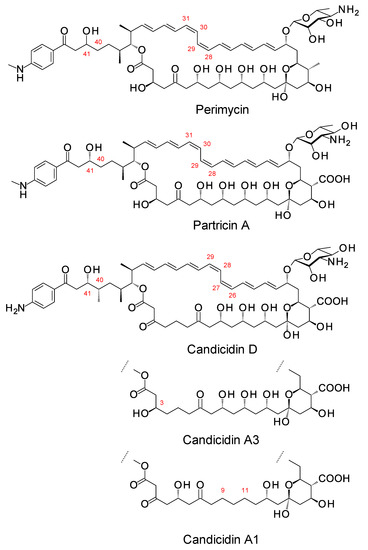 Aromatic heptaenes fall into two subgroups exemplified by candicidins and partricins. These mainly differ in the locations of two consecutive cis double bonds in the heptaene region and in the presence or absence of a methyl branch at C40 in the side-chain (Figure 3). Candicidins are produced as a complex of three major components, namely A1, D, and A3. The stereostructures of all three have been determined by NMR spectroscopy [35,36,37]. Stereostructures have also been determined for partricins A and B and perimycin [38,39]. Candicidins have been independently isolated from different microorganisms and given various names [36]. The nomenclature is summarized in the legend in Figure 3. The partricin group consists of polyenes with very similar macrolactone core structures, but some members have unusual late modifications. For example, perimycin has no exocyclic carboxyl group, and the sugar is d-perosamine, not d-mycosamine.