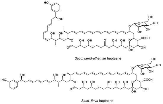 Usachova demonstrated production of the Sacc. flava heptaene, named flavatericin, but the partially purified material was not amenable to analysis by mass spectrometry. This heptaene had no detectable antifungal activity, as is consistent with the absence of an aminodeoxyhexose sugar. The Sacc. dendrathemae and Sacc. flava heptaenes may have other biological functions, such as signaling molecules that enable intercellular communication in mixed microbial communities [65].