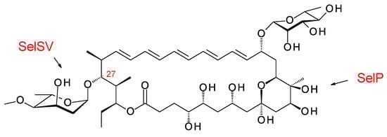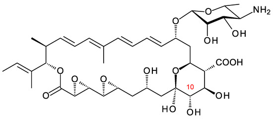 - Bruheim, P.; Borgos, S.E.; Tsan, P.; Sletta, H.; Ellingsen, T.E.; Lancelin, J.-M.; Zotchev, S.B.; Stocker, H.; Kruse, G.; Kreckel, P.; et al. Chemical Diversity of Polyene Macrolides Produced by Streptomyces noursei ATCC 11455 and Recombinant Strain ERD44 with Genetically Altered Polyketide Synthase NysC. Antimicrob. Agents Chemother. 2004, 48, 4148–4153. [Google Scholar] [CrossRef]