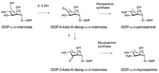 Biosynthetic pathways for GDP-α-d-perosamine and GDP-α-d-mycosamine.