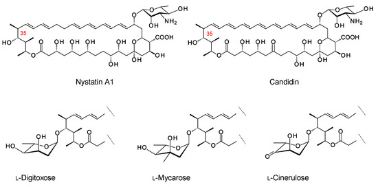 - Zielinski, J.; Jereczek, E.; Sowinski, P.; Falkowski, L.; Rudowski, A.; Borowski, E. The structure of a novel sugar component of polyene macrolide antibiotics: 2,6-Dideoxy-L-ribohexopyranose. J. Antibiot. 1979, 32, 565–568. [Google Scholar] [CrossRef] [PubMed]