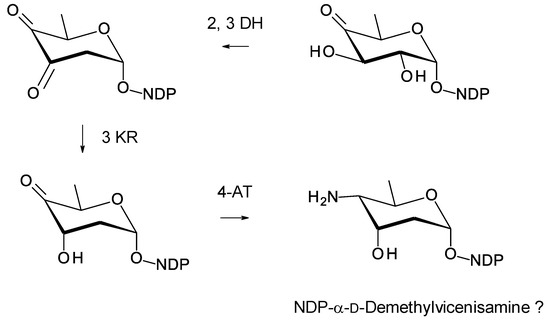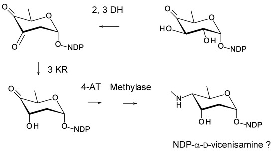 Most glycosylated polyene macrolides are modified with a d-mycosamine sugar. A few are modified with d-perosamine. Perosamine also occurs in the lipopolysaccharides of some Gram-negative pathogens. The biosynthesis of GDP-α-d-perosamine from GDP-α-d-mannose has been reconstituted in vitro and occurs in two steps: GDP-α-d-mannose 4,6-dehydratase catalyzes the formation of GDP-4-keto-6-deoxy-α-d-mannose, and perosamine synthase catalyzes transamination [72] (Figure 15). It has been proposed that GDP-α-d-mycosamine formation involves isomerization of GDP-4-keto-6-deoxy-α-d-mannose to GDP-3-keto-6-deoxy-α-d-mannose, followed by a transamination catalyzed by mycosamine synthase (Figure 15). There are several 3,4-ketoisomerases that act on dTDP-4-keto-6-deoxy-α-d-glucose, but no counterpart has been identified that acts on GDP-4-keto-6-deoxy-α-d-mannose. Spontaneous 3,4-ketoisomerization of GDP-4-keto-6-deoxy-α-d-mannose occurs slowly in vitro [73], suggesting that this step in mycosamine biosynthesis proceeds in the absence of an enzyme in vivo. GDP-α-d-mycosamine is a precursor for biosynthesis of vancoresmycin, a non-polyene macrolide. The vancosresmycin biosynthetic gene cluster contains AmphDIII and AmphDII homologues but also lacks a candidate 3,4-ketoisomerase gene [33]. Fluviricin macrolactam antibiotics contain l-mycosamine, the mirror image stereoisomer of d-mycosamine [74]. Biosynthesis of dTDP-α-l-mycosamine from dTDP-4-keto-6-deoxy-α-d-glucose also requires a 3,4-ketoisomerization step for which no gene or enzyme has been identified. These observations amount to circumstantial evidence that the 3,4-ketoisomerization is not enzyme-catalyzed. However, so far, it has not been possible to synthesize GDP-α-d-mycosamine from GDP-α-d-mannose in vitro, using GDP-α-d-mannose 4,6-dehydratase and GDP-α-d-mycosamine synthase enzymes [75].