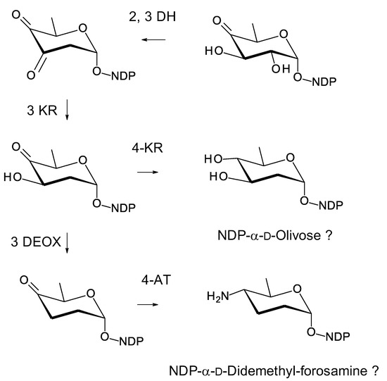- Hoffmeister, D.; Ichinose, K.; Domann, S.; Faust, B.; Trefzer, A.; Dräger, G.; Kirschning, A.; Fischer, C.; Künzel, E.; Bearden, D.; et al. The NDP-sugar co-substrate concentration and the enzyme expression level influence the substrate specificity of glycosyltransferases: Cloning and characterization of deoxysugar biosynthetic genes of the urdamycin biosynthetic gene cluster. Chem. Biol. 2000, 7, 821–831. [Google Scholar] [CrossRef]