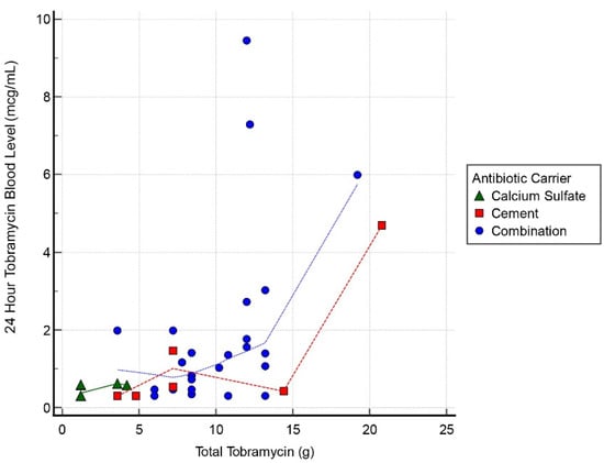 There are few studies associating the local concentrations of antibiotics and their resulting systemic blood concentrations with a combination of carriers [,]. There is additionally a scarcity of large studies documenting local antibiotic dosing and resulting postoperative kidney injury []. In this present study, 52 patients who underwent 58 procedures were investigated for the systemic tobramycin concentrations occurring at 24, 48 and 72 h postoperatively following treatment of orthopedic infections with a combination of local vancomycin/tobramycin laden antibiotic PMMA spacers, CS spacers, and combinations thereof. Preoperative and postoperative renal function was evaluated for any AKI as a direct result of the local antibiotic regimen.