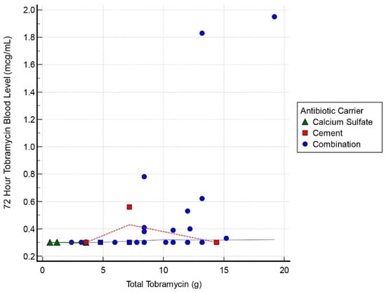 Scatter graph of tobramycin blood level (mcg/mL) and total tobramycin (g) at 72 h interval.