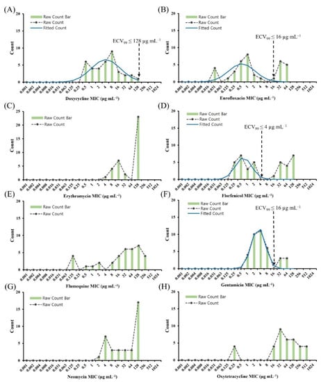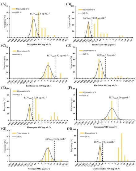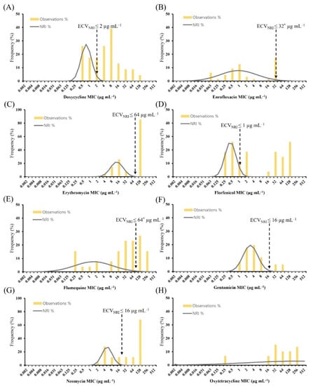 Figure 3 shows the histogram of MIC for eight antimicrobial agents against A. veronii using the NRI method. The ECVNRI values for doxycycline and enrofloxacin were 1 µg mL−1 and 0.06 µg mL−1, which categorized 10 (30.3%) and 25 (75.8%) isolates as NWT, respectively.